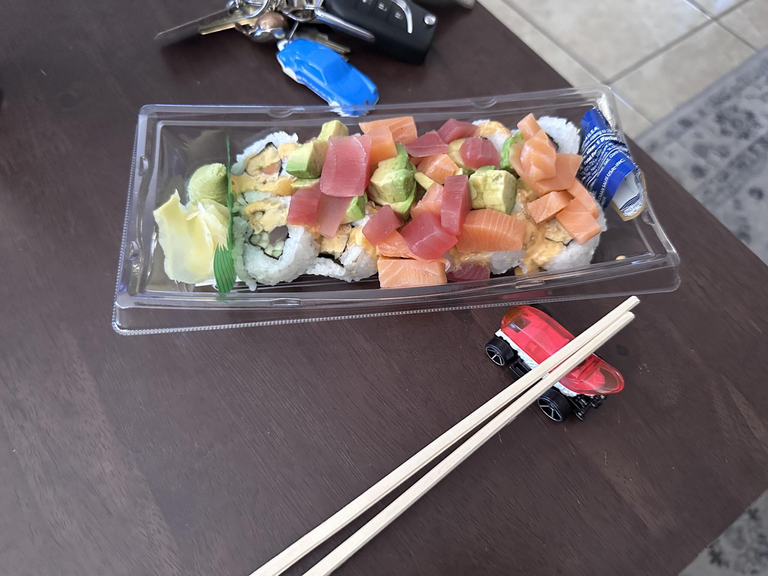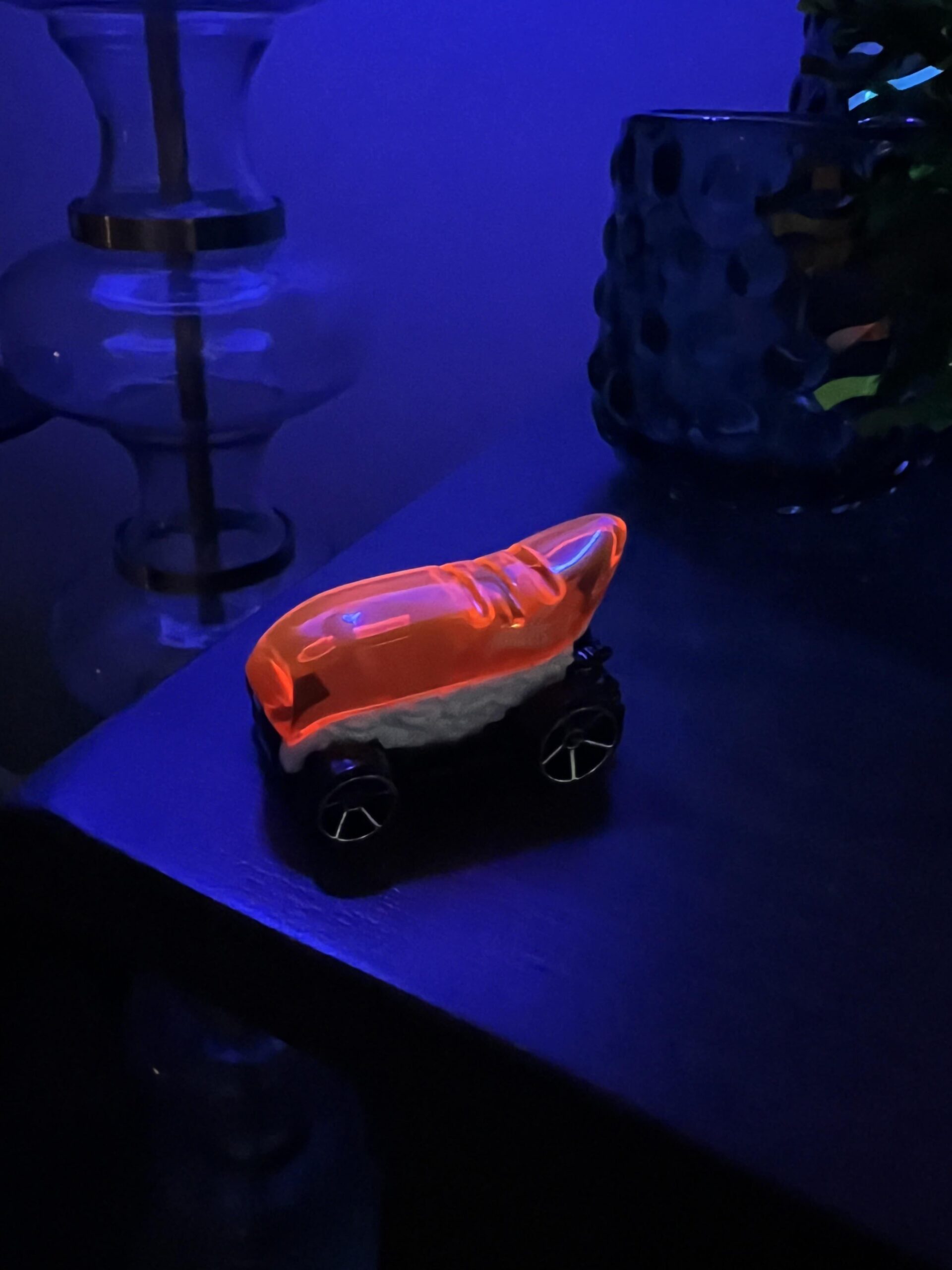 マグロの握り寿司を模したボディに車輪がついたぶっ飛んだデザインだが、マグロのネタ部分がホットウィールのロゴの形を表していたり、上部に箸を置ける溝が彫られていたりと細部のこだわりがすごい。